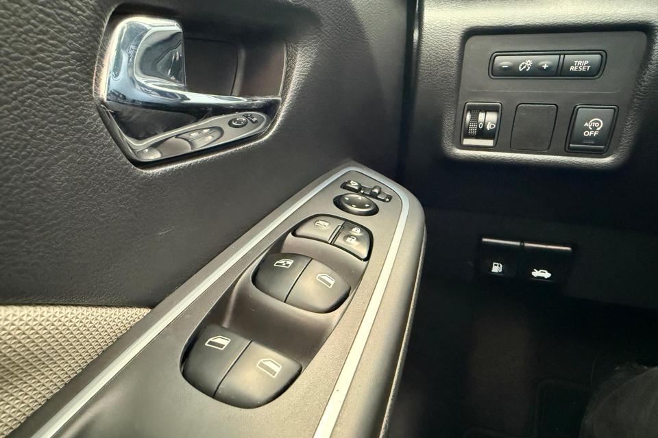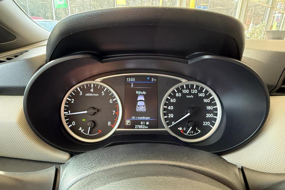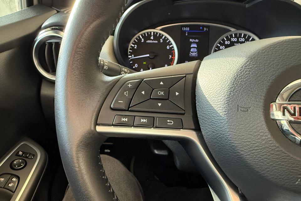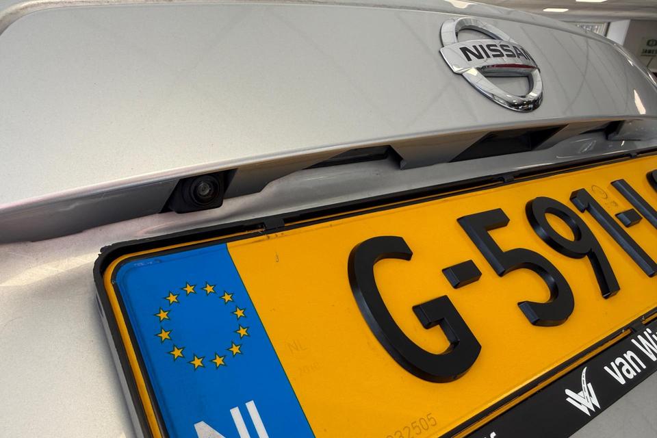 Bij het inparkeren hoeft u het laatste stukje niet te gokken: de achteruitrijcamera kijkt voor u uit. De bediening van het audiosysteem en het navigatiesysteem gebeurt met knoppen op het stuur. De audio is overigens voorzien van DAB-radio voor een altijd heldere ontvangst. Achter het stuur van deze Nissan bent u niet alleen. De auto kijkt als het ware met u mee tijdens de rit. De regensensor schakelt de ruitenwissers in als het nodig is en de automatisch inschakelbare verlichting doet de lichten voor u aan. De voordelen van de aanwezige cruise control hoeven we niet uit te leggen. Een mooie, constante snelheid - niet te snel, niet te langzaam. Precies goed. Met de ingebouwde airconditioning zit u altijd ontspannen achter het stuur. U bent in deze Nissan ook voorzien van automatisch dimmende binnenspiegel, lederen stuur, centrale deurvergrendeling met afstandsbediening en boordcomputer.