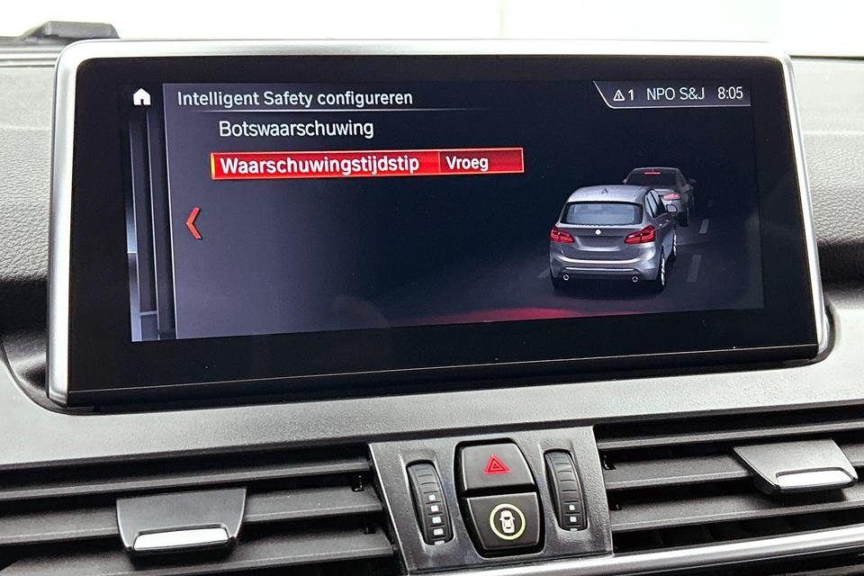 In de BMW 2-serie Active Tourer heeft uw veiligheid en die van uw omgeving prioriteit. Bij de veiligheidssystemen van deze BMW hoort ook de verkeersbord-detectie. Die leest tijdens het rijden als het ware met u mee en attendeert u op de significante verkeersborden langs en boven de weg. Een camera houdt de juiste koers binnen de rijstrook in de gaten en het Lane-keeping systeem corrigeert bij afwijkingen. Forward collision warning waarschuwt bij een dreigende aanrijding en vermindert de gevolgen van een ongeval. Met voorzieningen als head-up display, hill hold functie, brake assist en bandenspanningcontrolesysteem, bent u altijd veilig onderweg.